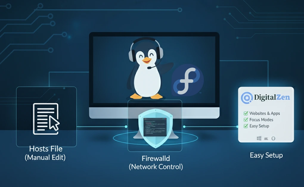 You can block websites in any Linux distribution, including Fedora, Ubuntu, and Debian, by editing the /etc/hosts file or using the Firewalld firewall service. These methods prevent connections system-wide. If you prefer a visual tool, you can use DigitalZen, a cross-platform app blocker that works natively on Linux.