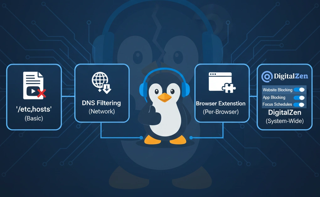 You can block YouTube on Linux using four reliable methods: editing the /etc/hosts file, using DNS-level filtering, installing a browser extension, or using a dedicated blocker like DigitalZen. The best method depends on whether you want a quick browser-only block or a system-wide solution that’s harder to bypass.